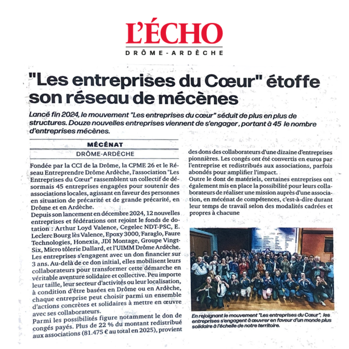 - La Fondation Les Entreprises du Cœur est lancée, Les Echos Drôme Ardèche, lundi 9 décembre 2024.
